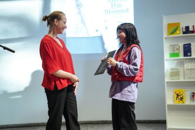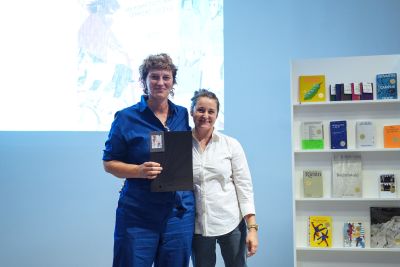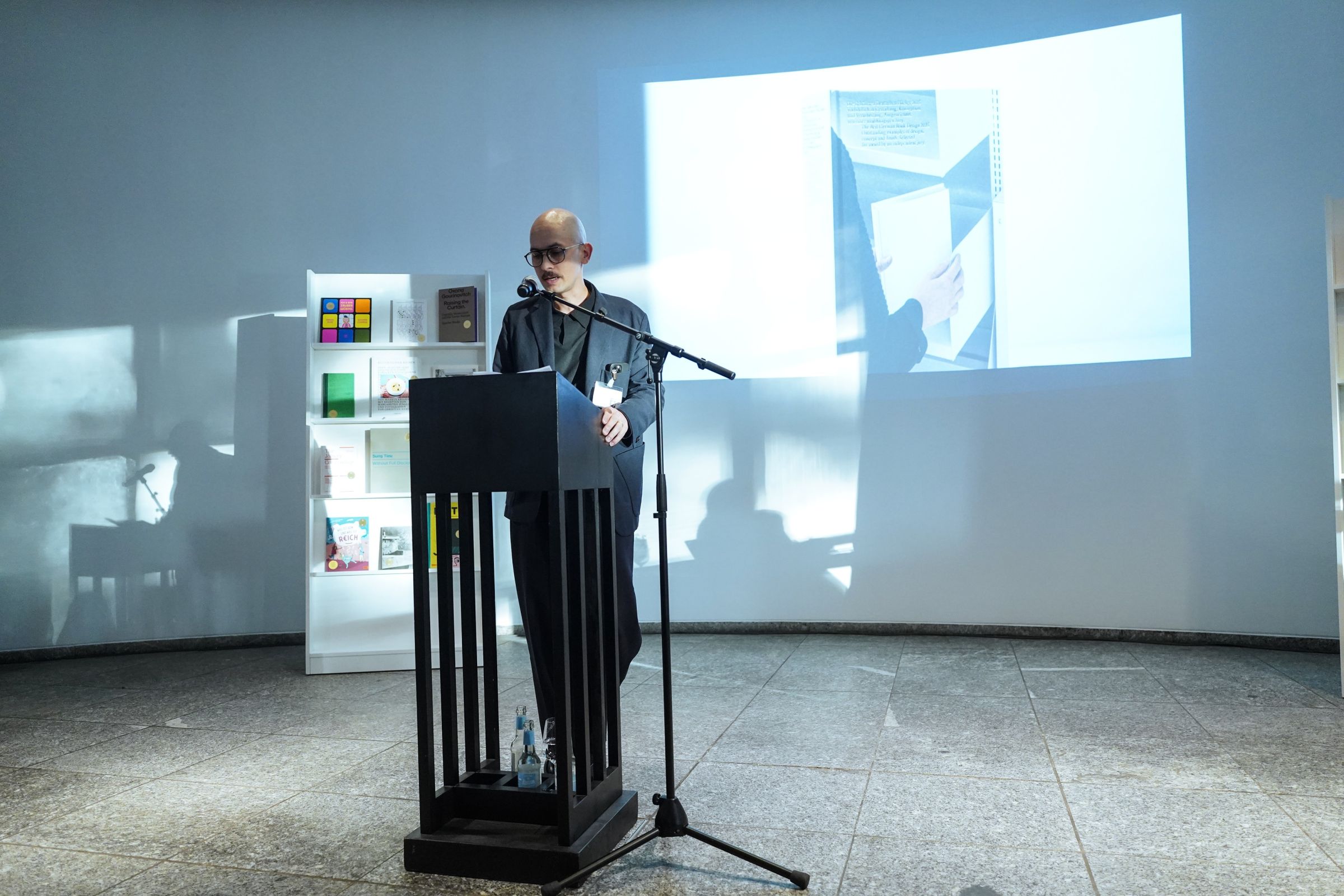 Die Preisverleihung fand am Freitagabend (08. September 2023) im Museum Angewandte Kunst in Frankfurt statt: Carolin Blöink, interimistische Leitung der Stiftung Buchkunst, und Dr. Joachim Unseld, Verleger der Frankfurter Verlagsanstalt und Vorstandsvorsitzender der Stiftung, vergaben den Preis in einem feierlichen Rahmen im Foyer des Museums.